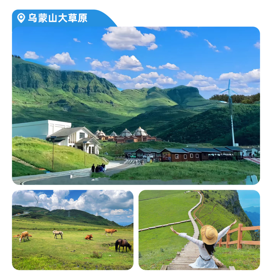 早餐后乘车(车程大概2.5小时)前往游览西南地区海拔最高、面积最大的高原草场【乌蒙大草原】(门票已含,不含景区电瓶车30元/人,必须消费敬请自理),最高海拔为2857米,年平均气温为11.1℃,是一个夏日避暑的良好去处。这里有一望无际的独特高原草场,有万亩高原矮杜鹃林,有充满神奇色彩美丽动人的高山湖泊,有民族文化浓郁的彝族风情,有世界罕见的自然奇观—佛光,并融雄、奇、险、峻、幽于一身的牛棚梁子大山、八担山等。驻足乌蒙大草原,闭目感受草原四季变化的花落花开,放眼望去波澜壮阔。雾起时刻,人在云上、云在脚下,白云随风卷起千层浪,仿佛走进人间仙境,心旷神怡。