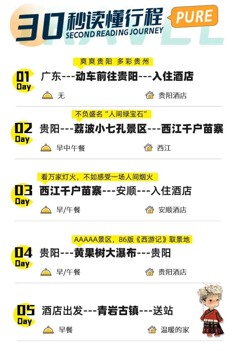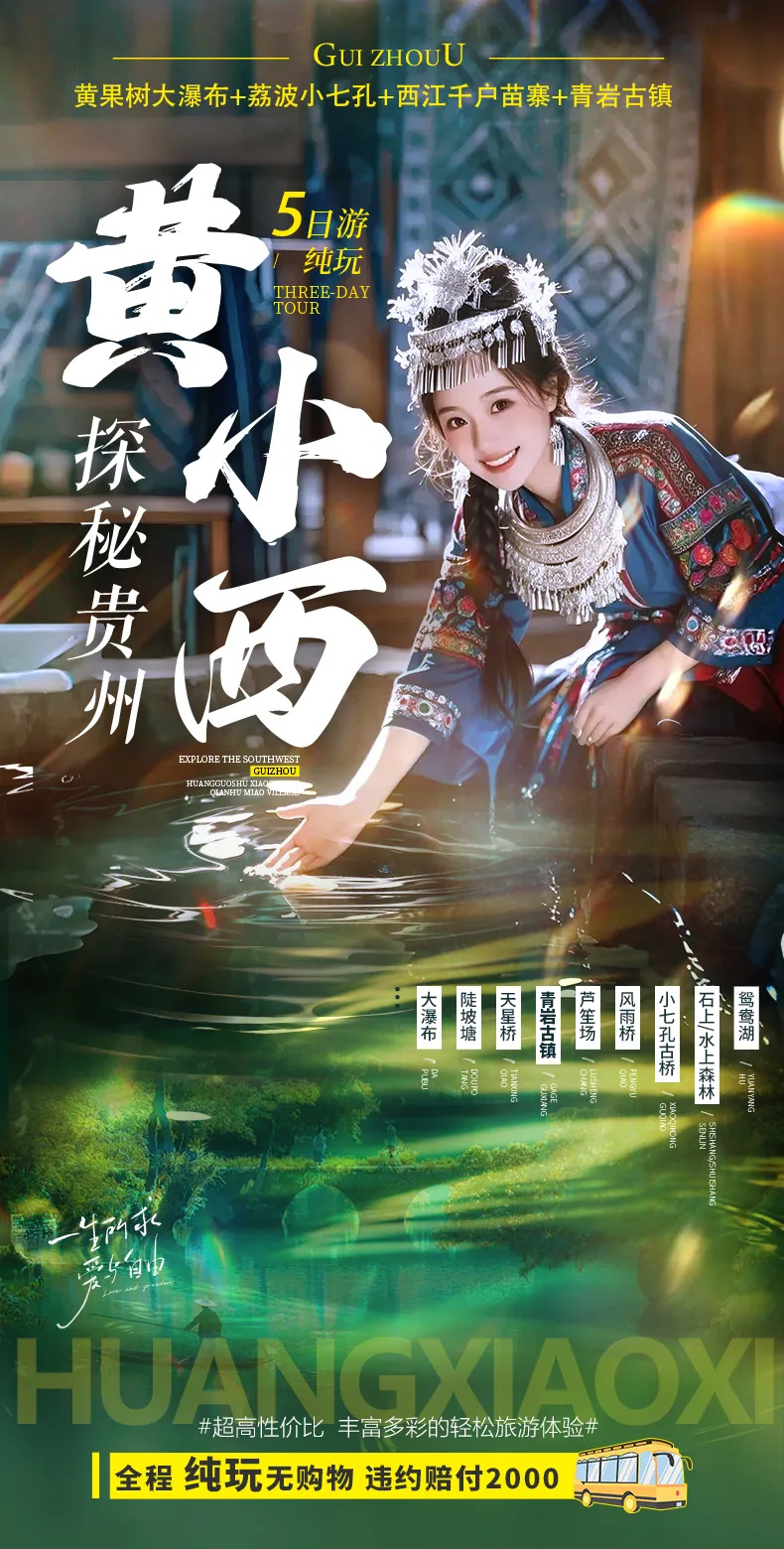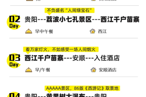 10. 贵州地处云贵高原地区,山路较多,请穿轻便、柔软休闲鞋子;贵州素有天无三日晴之说,天气多雨,请自备雨伞;少数民族寄居地,请遵循当地风俗。