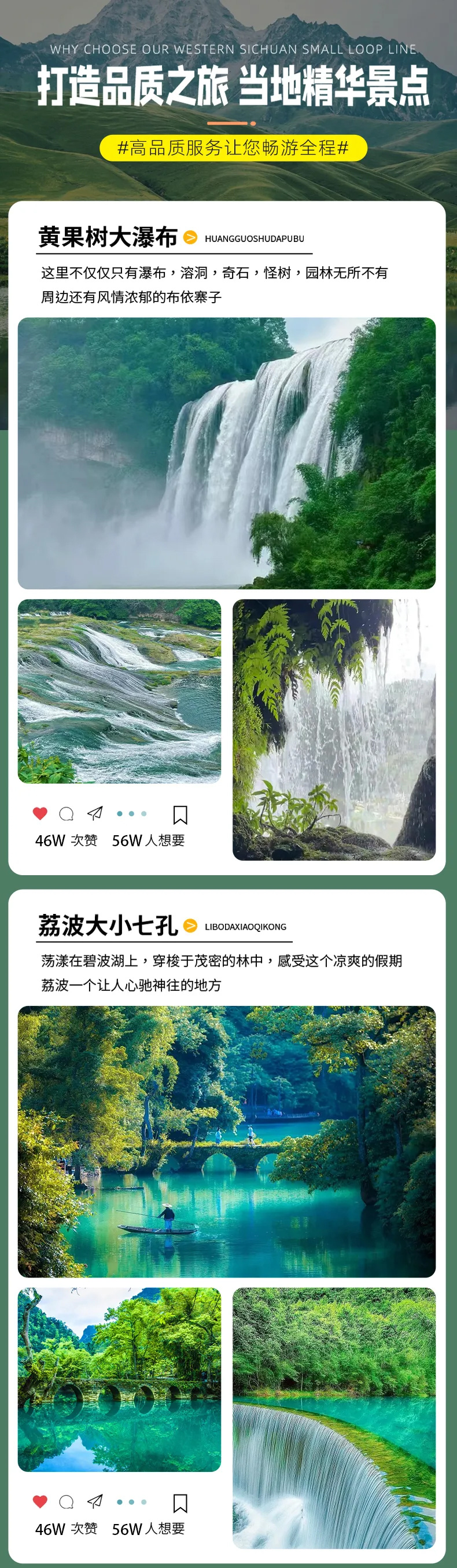 4. 贵州景区普遍较大,因团队中各家庭游览速度快慢不一,为避免影响贵宾行程体验,导游会在车上统一讲解,告知景区游览线路、主要特色、集合时间和地点,在关键的路口指引游览方向并执行部分讲解职能,进入景区后自由活动。