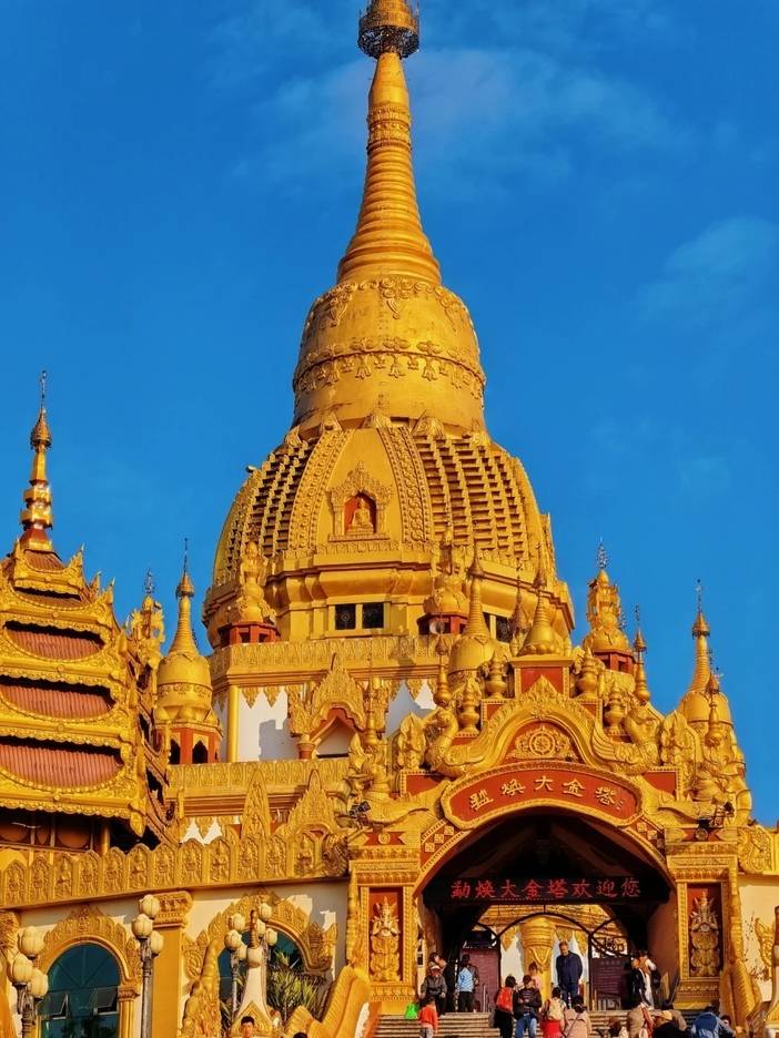 午餐后前往瑞丽,游览【勐焕大金塔】 传说“释加牟尼”生前转世为金鸡时曾生活于此地,整座塔高76米,塔底基座直径50米,造型为八角四门空心佛塔,下3层为空心大厅。塔身主体为钟型大塔,第二、三层各建有小塔8座,第四层外平台建有8个精美的花瓶塔。基座之上的主心柱以大钟和13个钵上垒砌而成,最高点戴有重达2.3吨的大金顶,堪称中的一个金佛塔,亚洲第一空心佛塔。高耸挺拔,雄伟壮观,气势恢宏。
