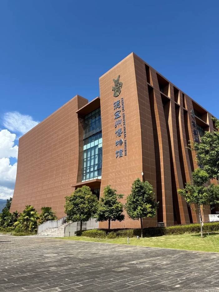 游览【德宏州博物馆】,德宏州博物馆是独具特色的德宏州第一个德昂族博物馆,是德宏州“三馆”项目之一,博物馆建筑风格现代,外观呈不规则的立方体,形似一方“宝盒”,外墙肌理抽象地表现了亚热带榕树的根系,墙面采用云南高原赭红土色,寓意“植根德宏,面向四方;收藏德宏,筑梦文博”。展出历史、民族民俗文物及展品840余件套,其中国家珍贵文物30余件套,包括文物“龙江型不对称铜钺”衍生的馆标。基本陈列以“西南丝绸之路上的璀璨明珠”为主线,分设序厅、自然厅、历史厅及民族厅、辐射厅,全景展现德宏从西汉滇越乘象国到现代自治州的历史脉络、生态资源及多民族文化。(周一闭馆更改为夜游傣族古镇)