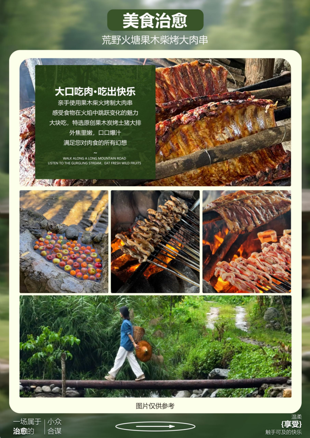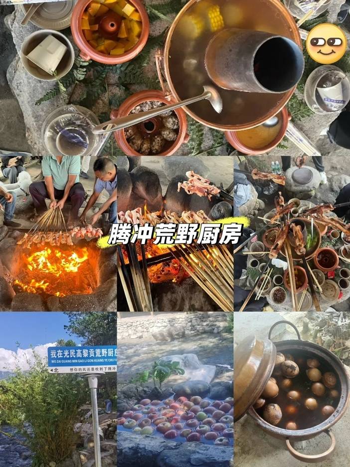 酒店用早餐,乘车前往山野厨房森林野餐+果木柴烤土猪肉。别致的森林木屋,身临其境的高黎贡山野厨房,引领我 们进入一场美食神奇之 旅!在高黎贡山森林里, 我们将品尝到森林手抓饭的鲜香、森林咖啡的浓郁、 高黎贡山古树茶的回甘、还有森林烤肉的火爆,这些美食在森林的陪伴下,绽放出无穷的诱惑与创意。 而冰凉的山泉水冰水果更是我们热辣舌尖的消暑利器,融合了水果的清甜,带来一份令人陶醉的滋味荒野小滚锅足浴体验 缓解疲劳。中草药与热水的完美融合,暖身更暖足缓解疲劳。赠神秘 惊喜盲盒!!