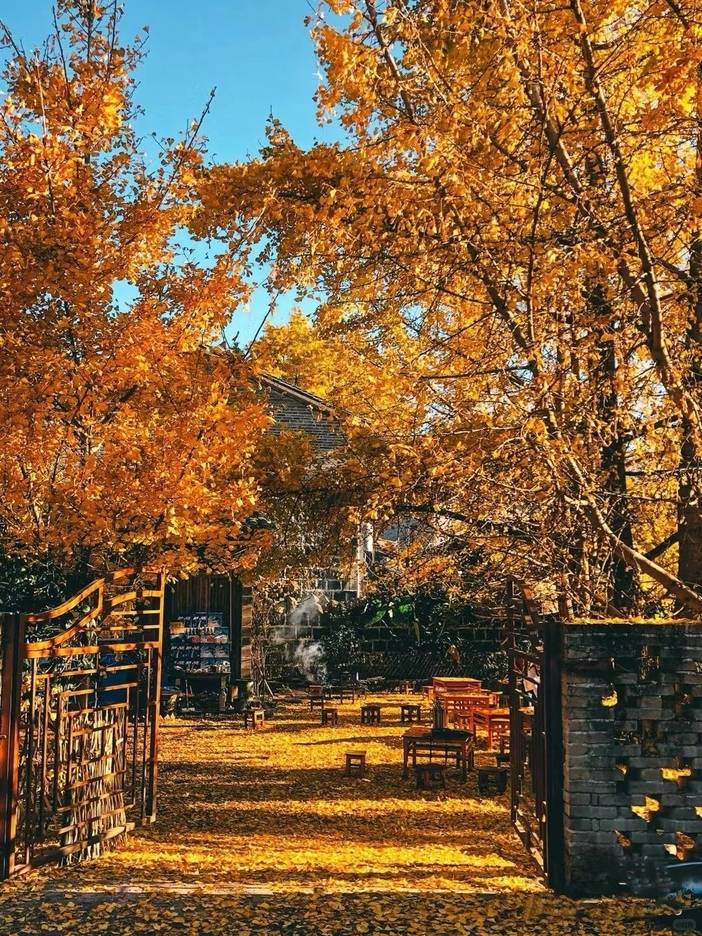 银杏村:金秋十月来到江东古银杏村,沿着江东村由火山石铺成的小道,慢慢走进古银杏村时,一地金黄,小路上、墙头上、瓦房上、水沟边、菜地里… …漫步村中小巷,不经意间,银杏叶洒满一身,与夕阳的余辉融为一体,宛如天堂的静谧秋景;