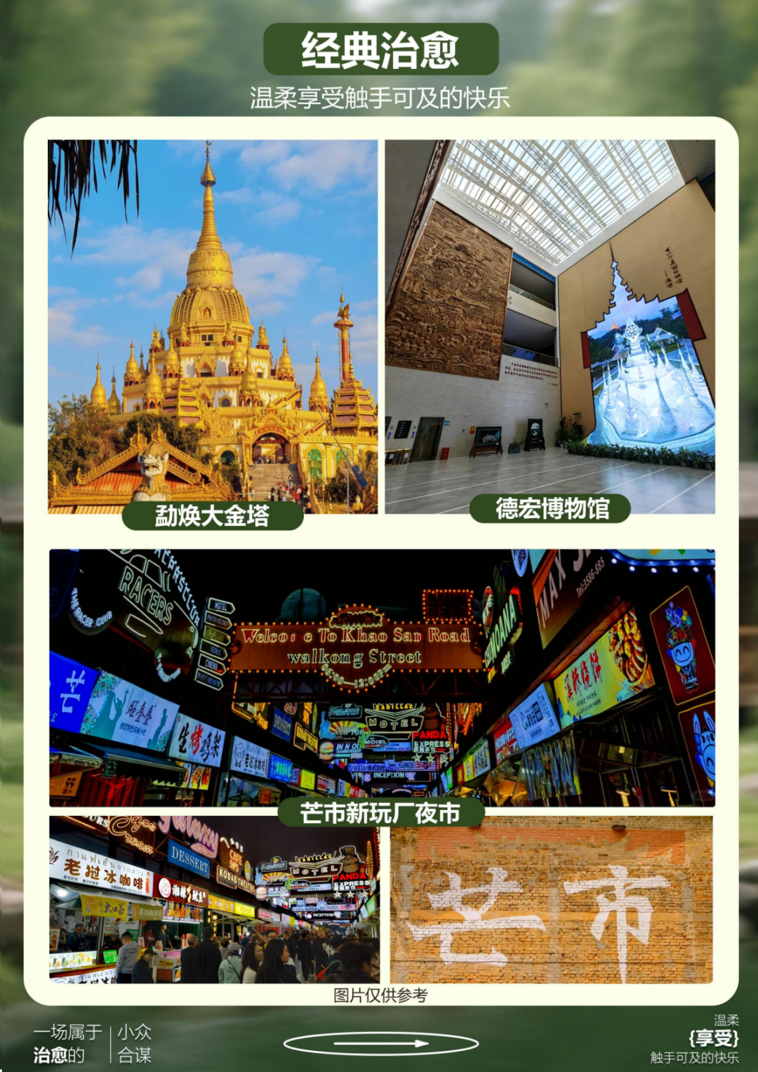 游览【姐告国门】,来到瑞丽当然要去庄严的国门看看,这里是开放之门,合作之窗,友谊之桥,聚居了大量的外国友人和少数民族同胞们,为这座边境国门增添了不少人间烟火气。“姐告”是傣族语言,含义为“古城”,指的就是瑞丽,姐告国门发展到今天也曾历经了四次历史变革,现在的新国门已经成为了每个来瑞丽的游客,都要参观的网红打卡场所。