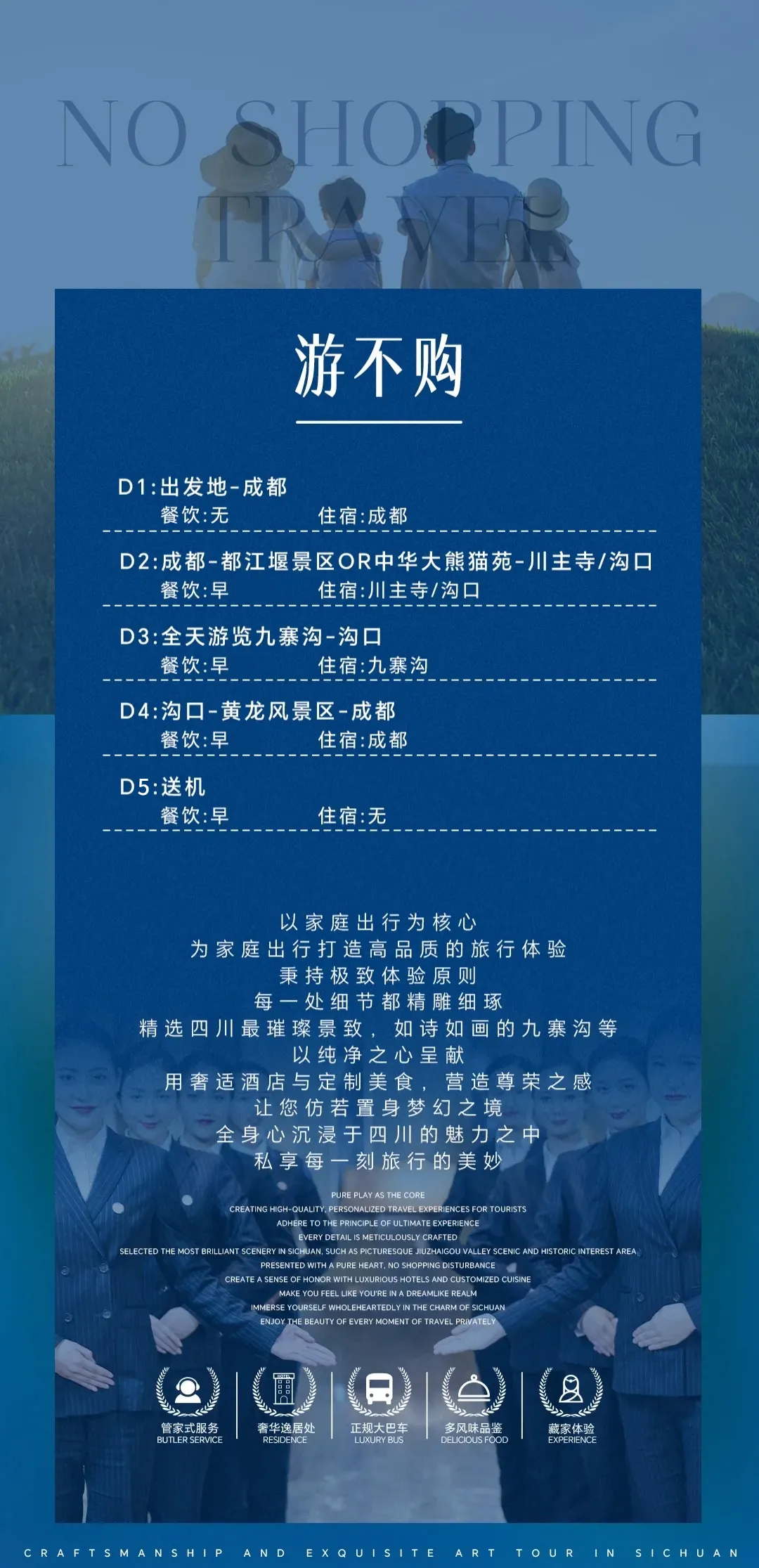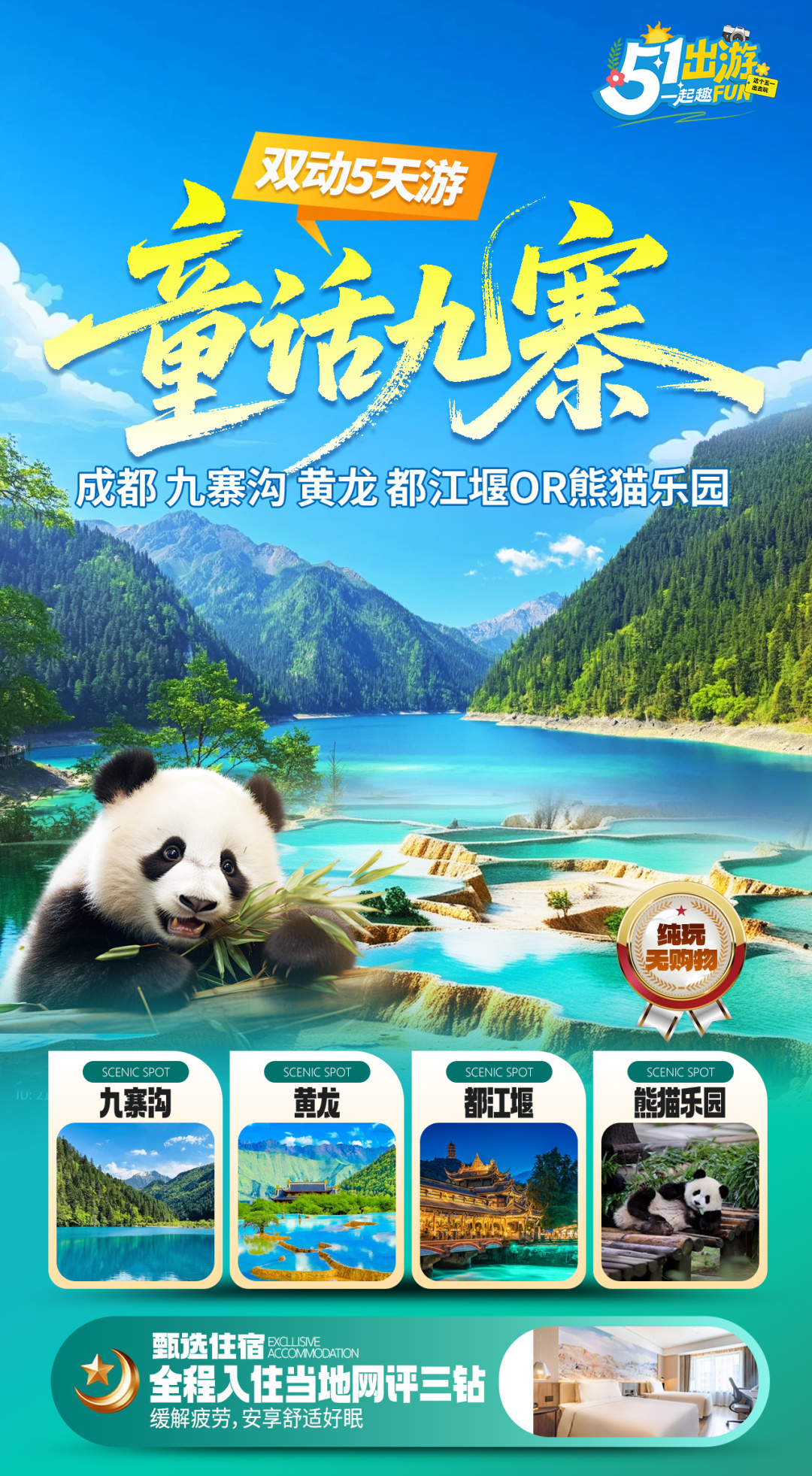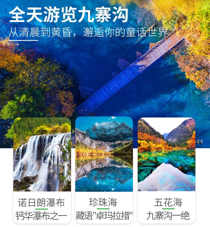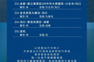 [游览] — 九寨沟风景区、黄龙风景区、都江堰风景区or中华大熊猫苑 [尊贵] — 全程入住舒适型酒店,网评指定3钻(可自费升级为携程4钻) [纯粹] — 无年龄地域限制,全程不进购物店 [独家] — 有趣的玩法百里挑一,不走常规的纯玩九寨之行 |