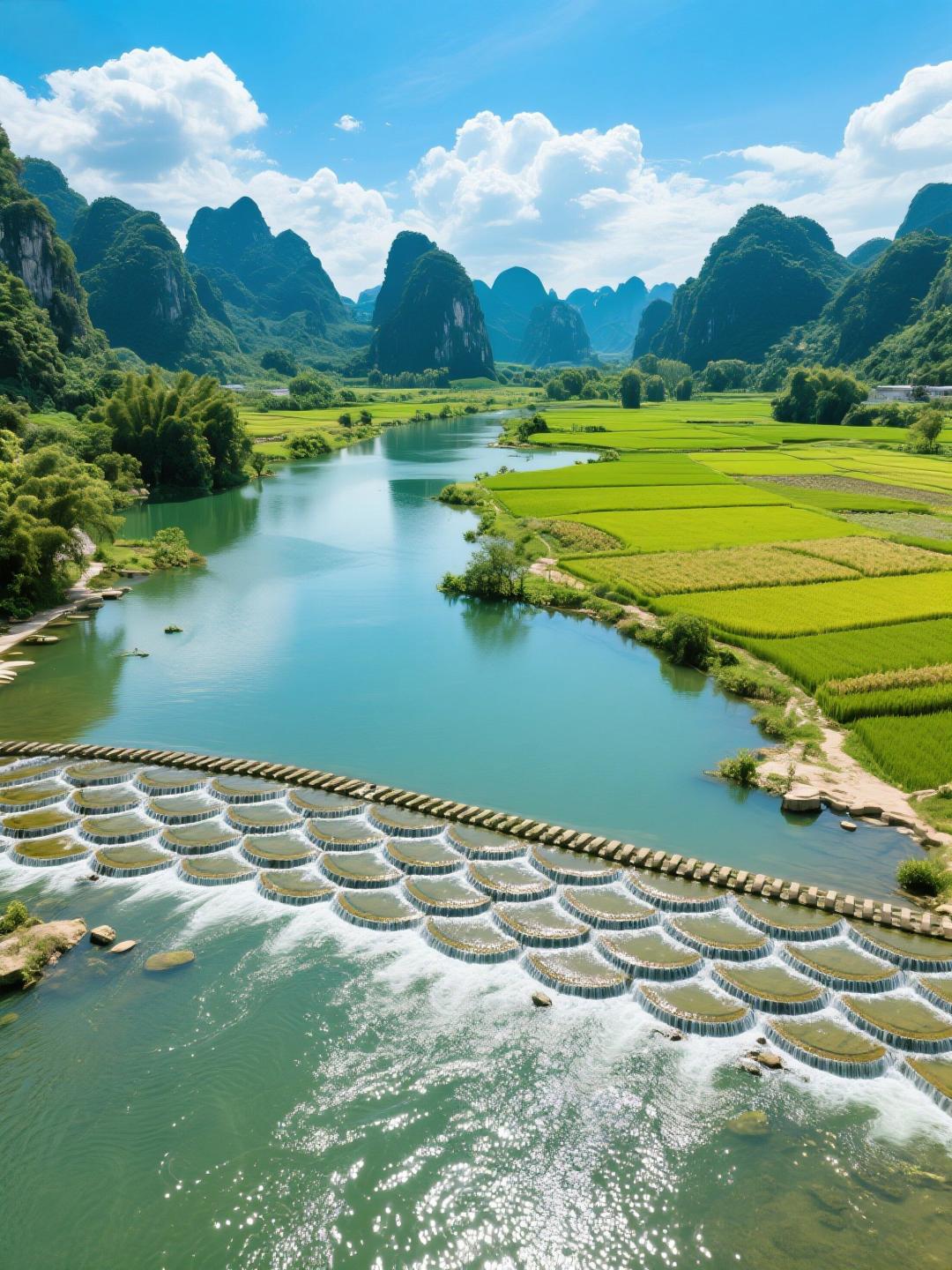 这里翠竹绕岸,农舍点缀,独木桥横,稻穗摇曳,农夫荷锄,牧童戏水,风光俊朗清逸,极富南国田园气息。