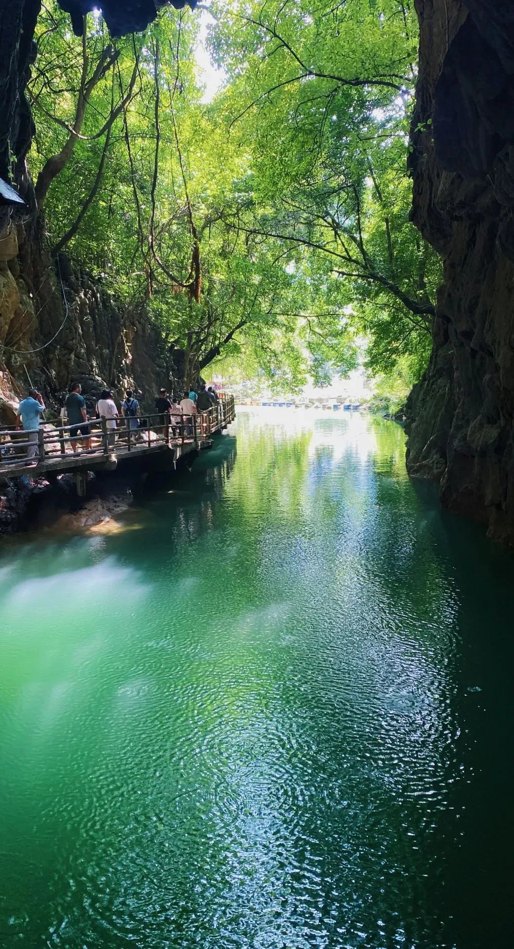 09:00 抵达大峡谷,步行下山,乘坐【皮筏艇船漂流】穿越古劳峡、迎宾洞及地下暗河、新灵峡、百福洞及地下暗河,和孩子们一起在漂流途中欣赏幽深旷野的峡谷风光,享受漂流带来的亲子欢乐。