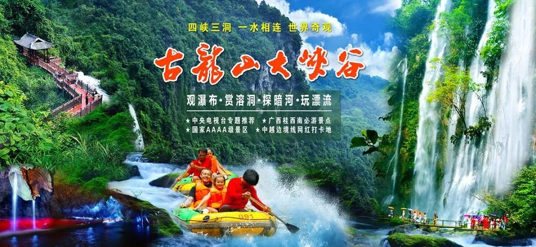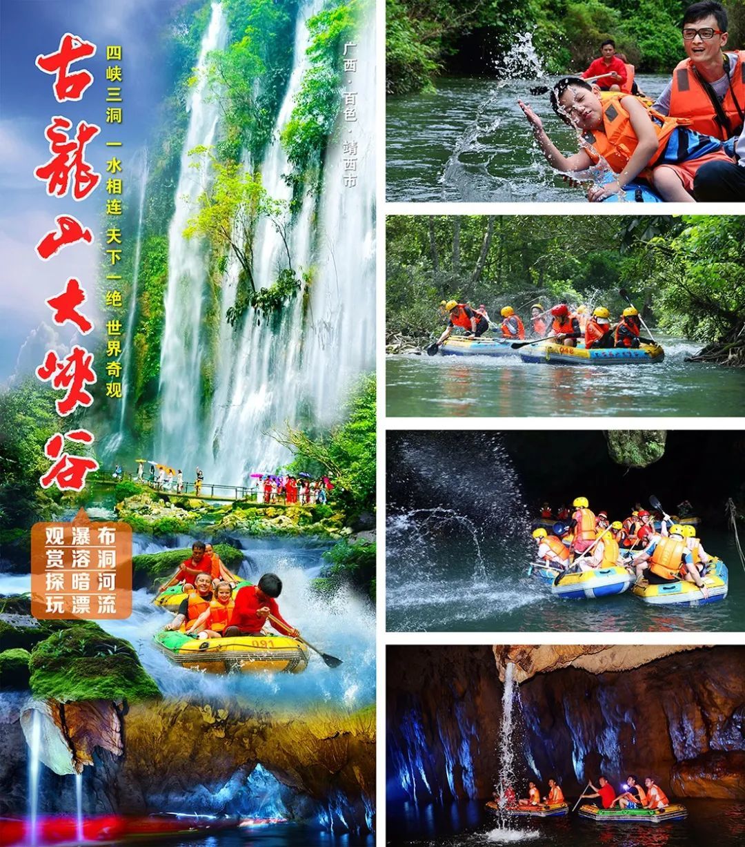 三个地下暗河溶洞及单级落差128米的古龙大瀑布和12个美如画卷的壮丽瀑布景观组成,全长7.8公里。有峡谷观光游(徒步)、地下河探秘漂、三峡二洞经典漂、三峡二洞自由漂、快乐激情漂等好玩项目。