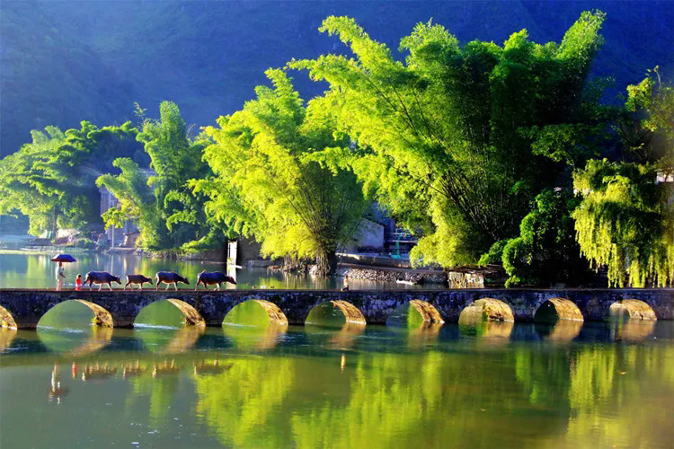 光与影交织的鹅泉,小桥流水,袅袅炊烟,辛勤劳作一天的牛群,走在洒满光晕的石桥上,这里正是陶渊明笔下田园生活该有的模样。