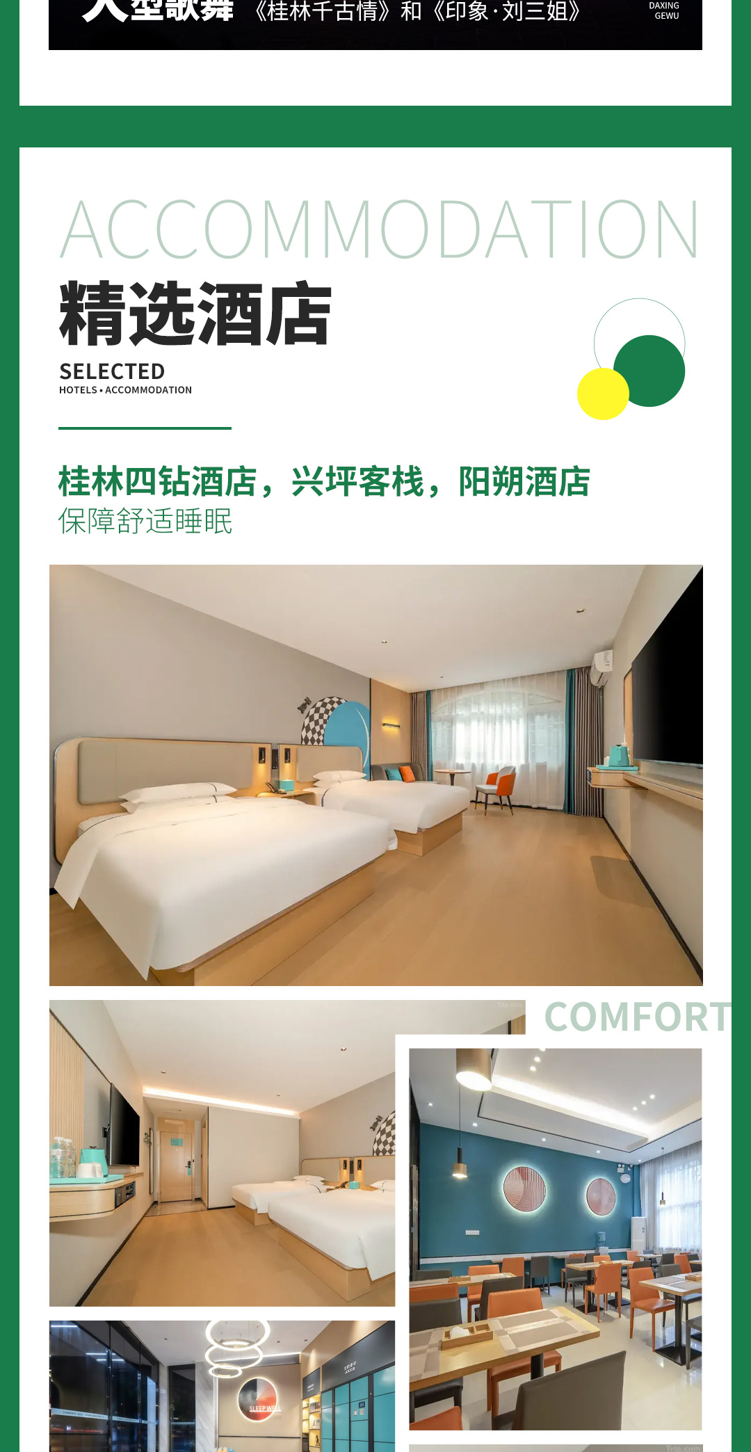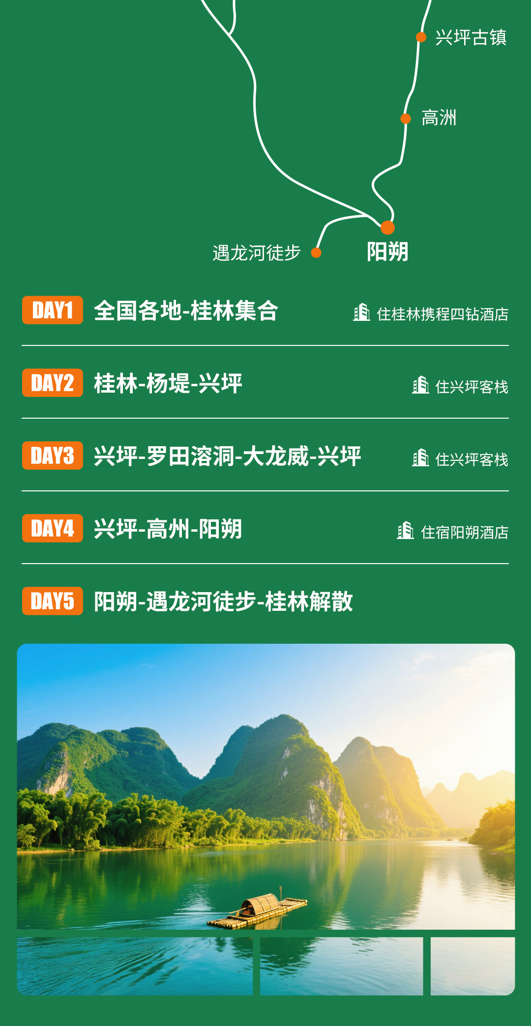 2.住宿:桂林四钻酒店,兴坪客栈,阳朔酒店,单人报名组织方优先安排同性拼,如遇到无同性需补房差400元,五一/国庆5天房差600元)