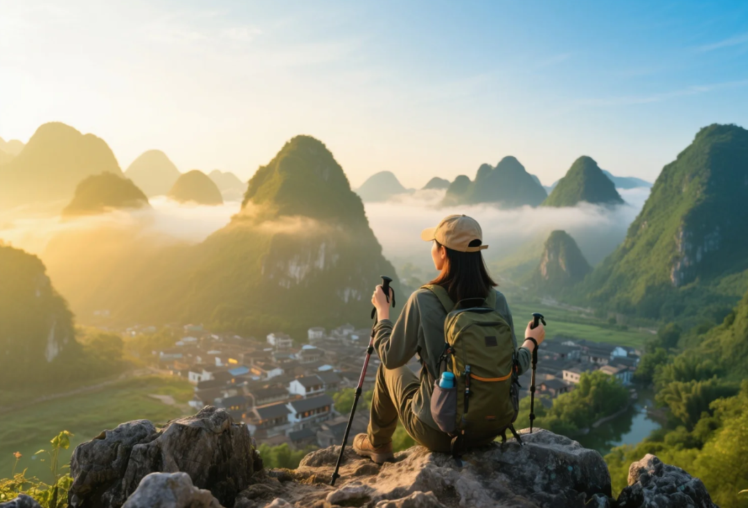 14:30左右抵达客栈徒步完成,体力好的伙伴入住后还可以继续前往登老寨山一览全景,也可以自行选择竹筏游漓江,感受水中的画廊美景。