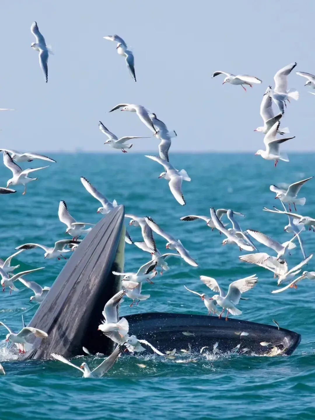 当船驶向深海,布氏鲸们,就会探出脑袋,在海面上进食,一旁还有成群的海鸟盘旋于天际,真的把动漫里的场景搬进了现实,震撼又治愈~