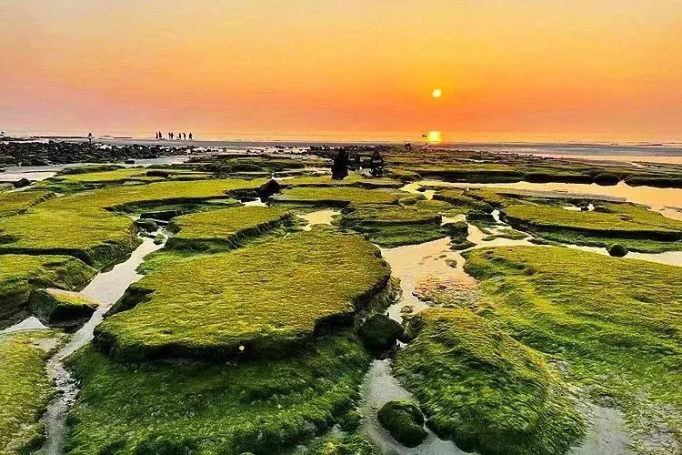 在涠洲岛东海岸,有一片长达1.5公里的海蚀平台,在朝阳的照映下,海蚀平台上的青苔与海水相互辉映,五彩斑斓,因此得名五彩滩