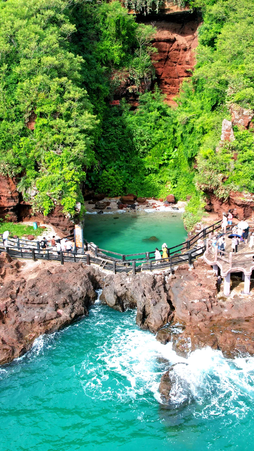 鳄鱼山就是涠洲岛上最负盛名的景点,它就像是一只“绿色巨鳄”潜伏于海岸之上。沿着海边栈道漫步,一边是汹涌的大海,一边是奇特火山岩,登顶后便可俯瞰整个海湾