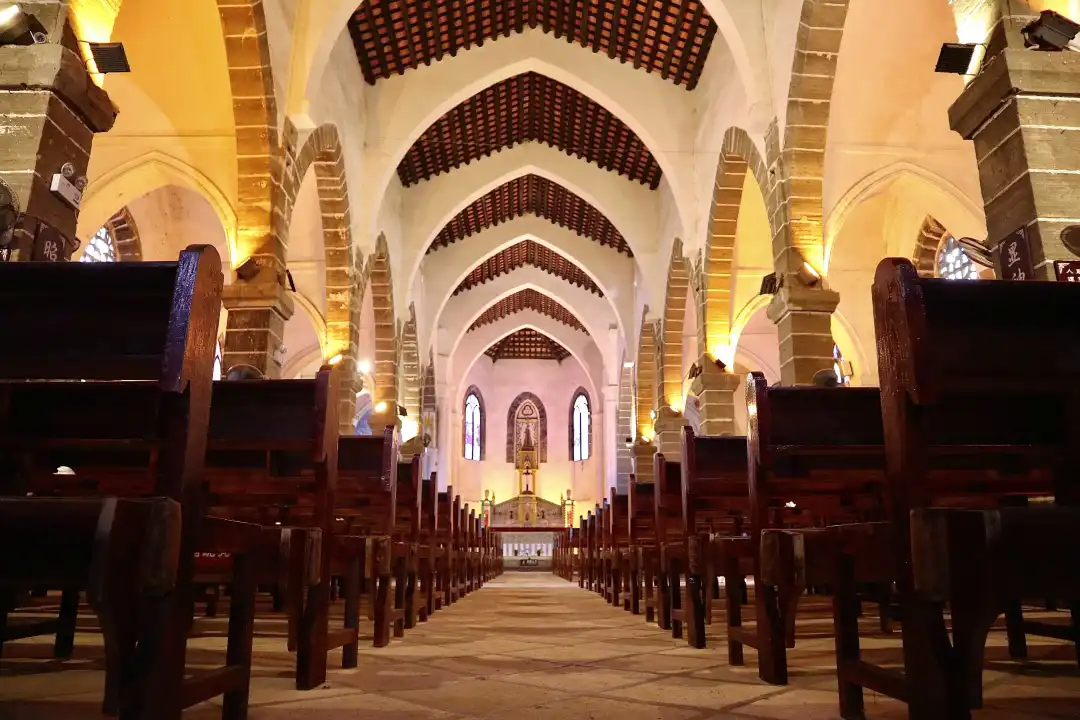 在周围低矮简朴的民居,和芭蕉树、菠萝蜜树林的映衬之下,这座始建于清朝的天主堂,显得格外气势恢弘