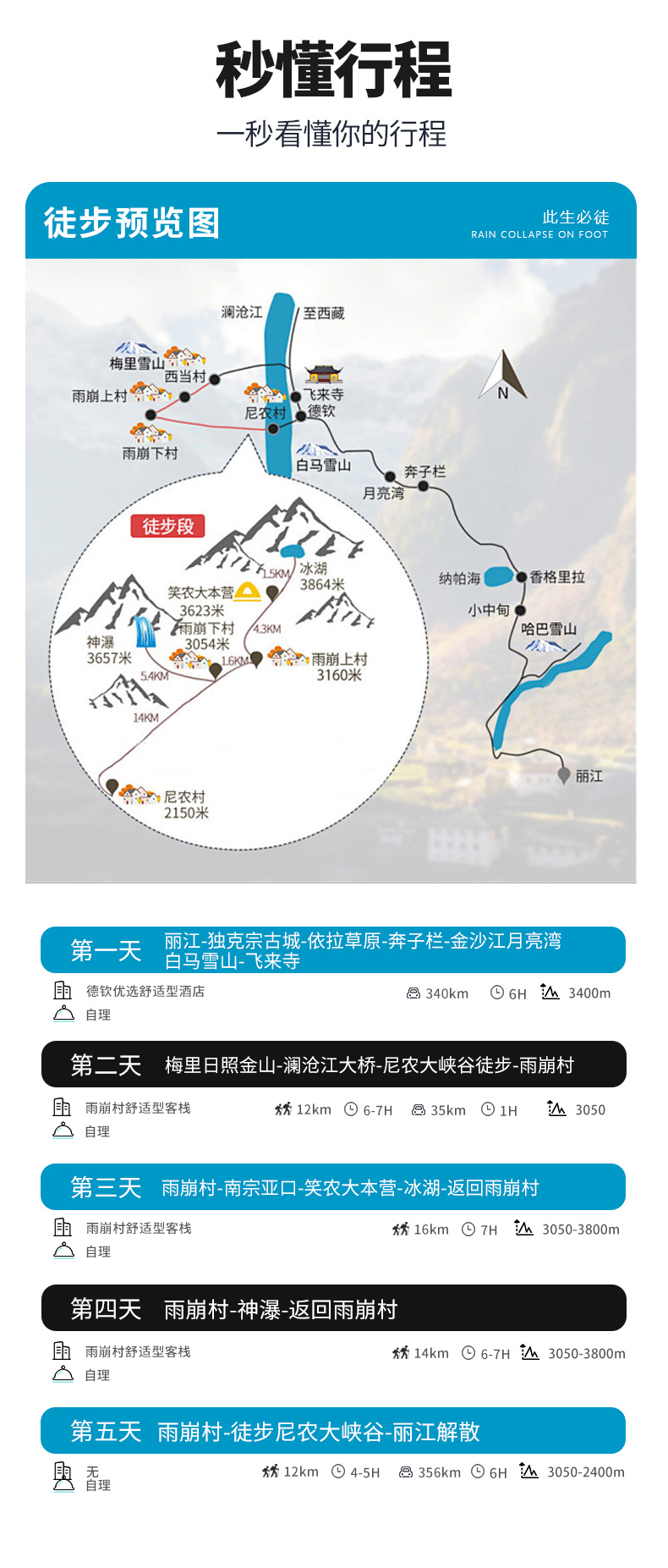 吃过早餐后前往尼农村,途经澜沧江峡谷约1小时抵达尼农,随后开始徒步向雨崩村前进。今天全程大约14公里。用时6-7小时。沿着尼农大峡谷一路徒步,两边是悬崖峭壁,这是古人从悬崖上凿出来的一条通往雨萌秘境的阳光大道。徒步大约3.5小时到达补给点在这里稍作休息,后沿着公路前往雨崩,沿途美景如画,令人目不暇接。