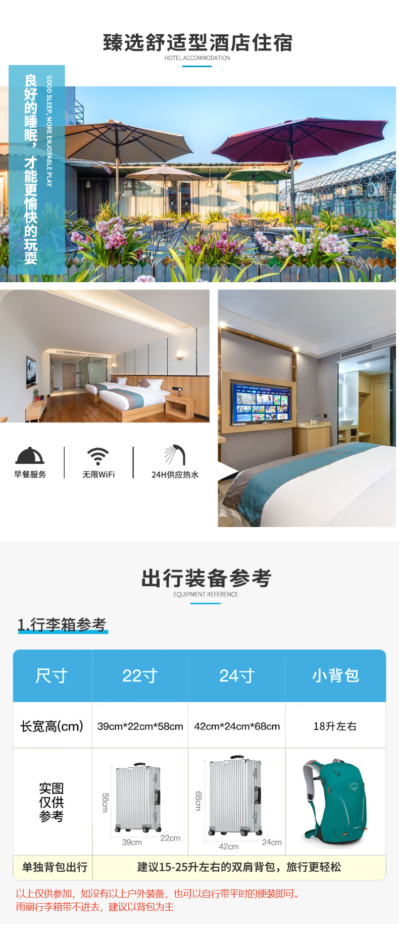 1、装备:每人饮用水1瓶、一次性雨衣1件(仅限雨季)、户外魔术头巾1条、登山杖2支(为了环保,我们鼓励领队回收登山杖,希望得到您的理解和支持);