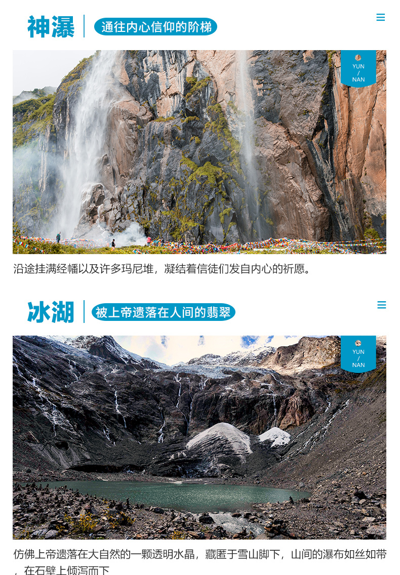 这里可以观看神女峰和五冠峰的全貌,更重要的是这里是朝圣者接受洗礼的地方,只有接受过神水的洗礼,整个朝圣之旅才算是完整,身体和心灵都得到净化,而后我们将原路返回雨崩村客栈休息。
