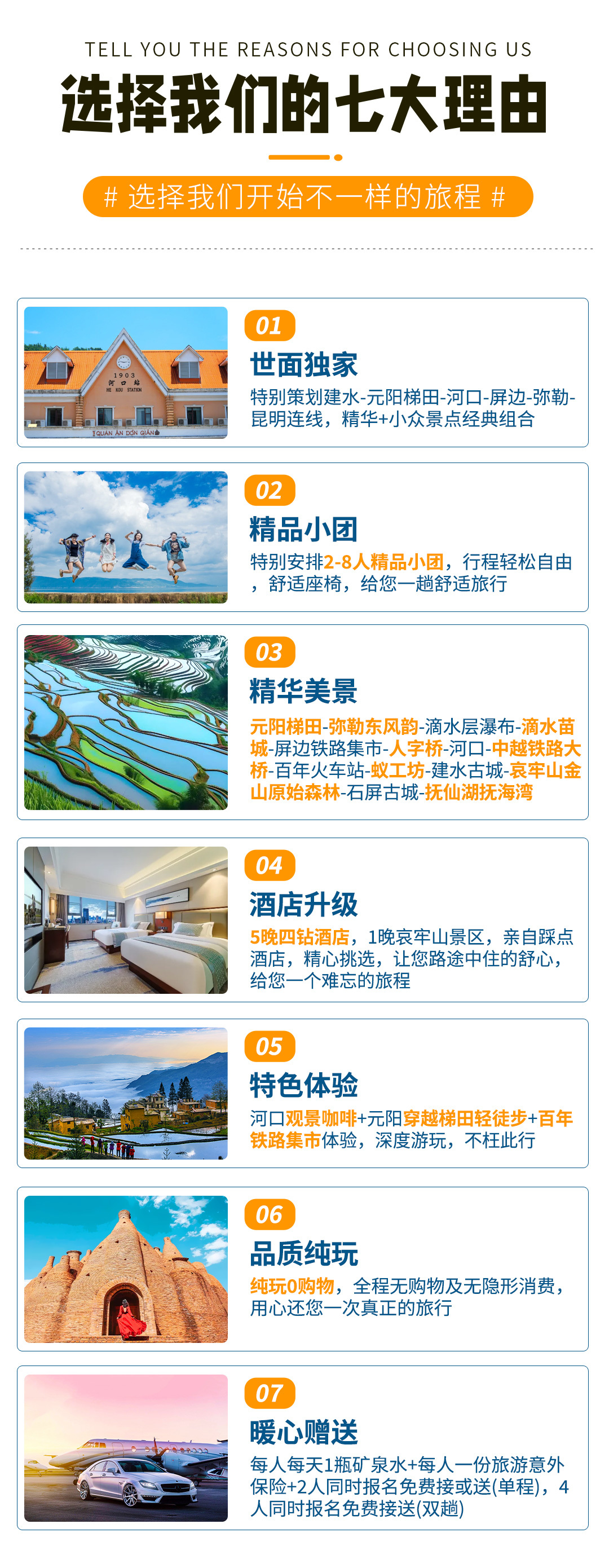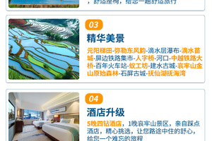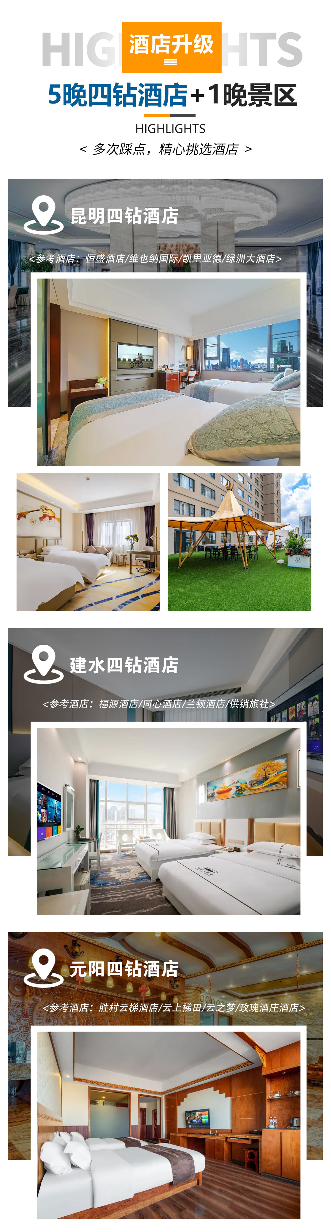 3、住宿:全程6晚住宿(5晚4钻酒店+1晚哀牢山景区)昆明四钻酒店1晚,屏边四钻酒店1晚,河口四钻酒店1晚,元阳四钻酒店1晚,建水四钻酒店1晚,哀牢山农家1晚