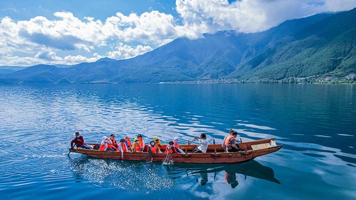 随后我们乘【猪槽船】游览泸沽湖,观赏泸沽湖美丽的岛屿风光,一弯碧水,白云、蓝天、青山都清清晰晰地装在湖里,上下天光浑然一色,湖面金光闪闪,邂逅如仙境般的湖光山色!(6、7、8月份可看到泸沽湖网红水性杨花哦)。