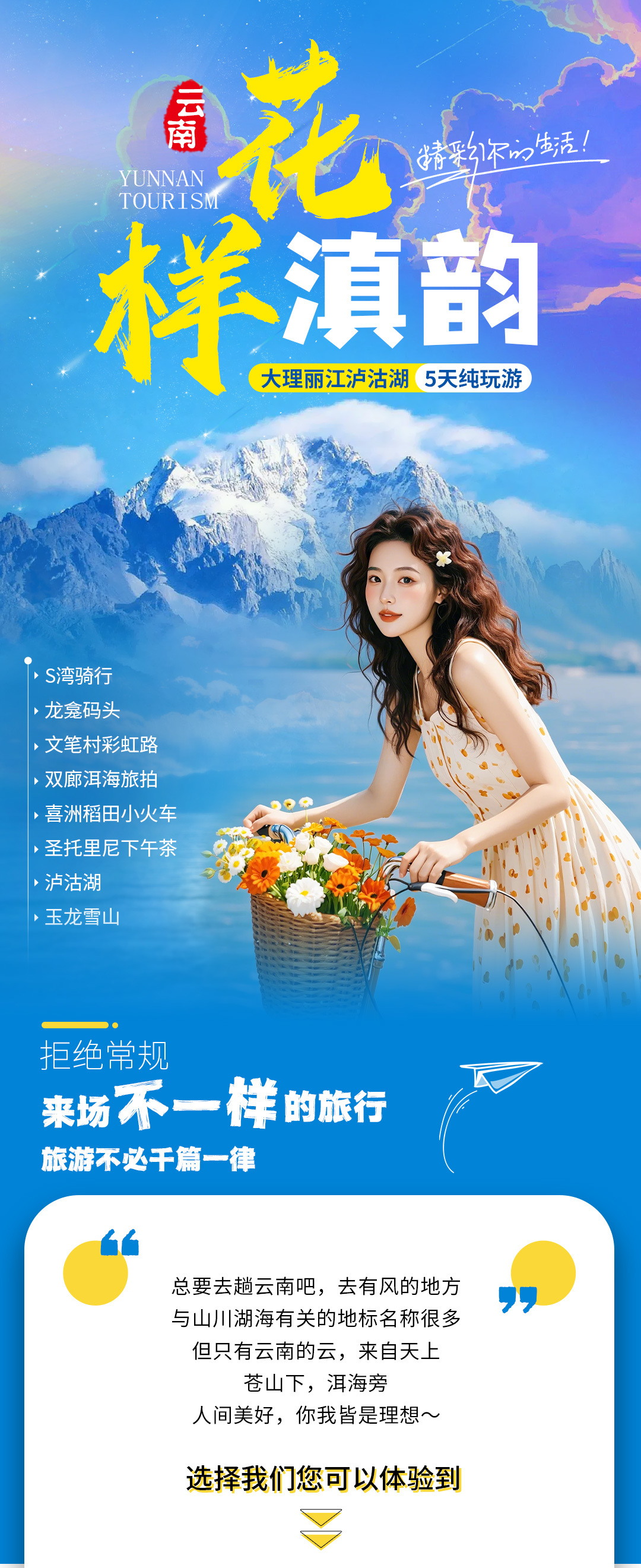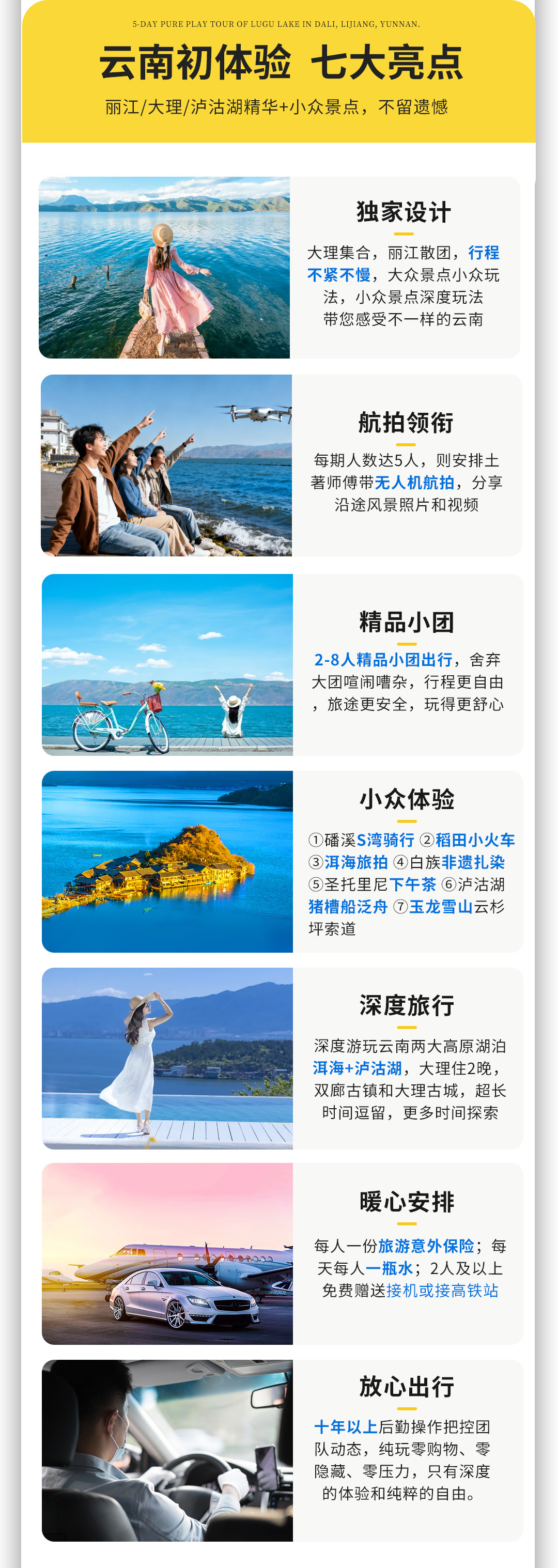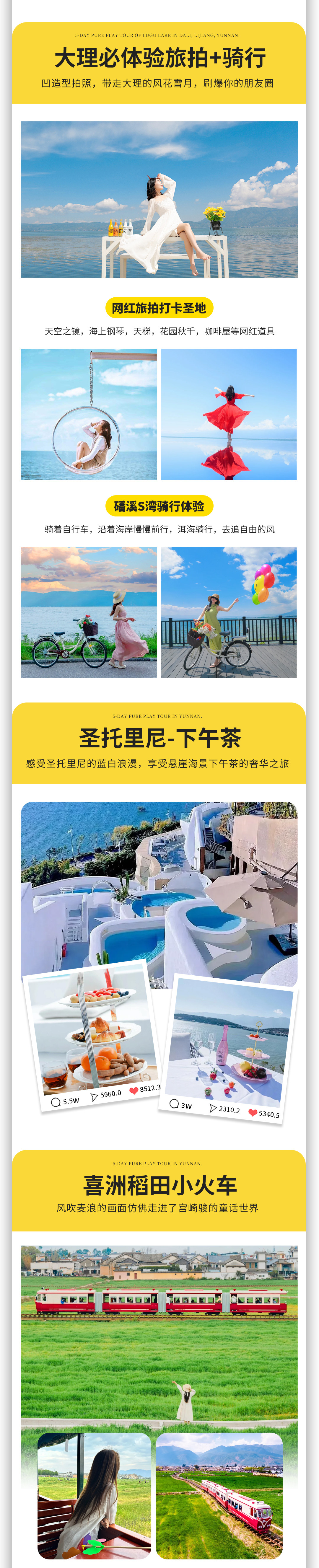 3、体验项目:磻溪村S湾·骑行体验,稻田小火车,白族非遗扎染体验、洱海旅拍费用(天空之镜,海上钢琴天梯,花园秋千,日落之窗,咖啡屋等道具使用 ,含额外赠送每人6张简修电子照片),圣托里尼下午茶,泸沽湖篝火晚会;(备注:体验项目不退不换,不参与不退费);