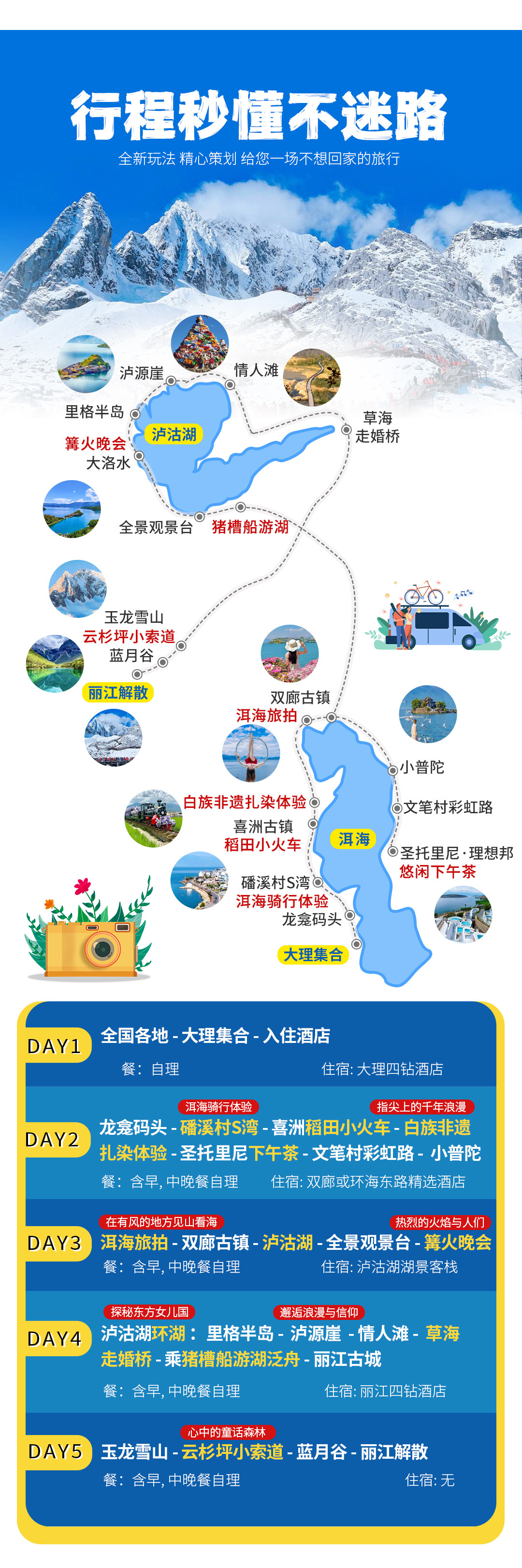 4、儿童价格:(不占床位,不含门票,含体验:旅拍+下午茶+稻田小火车+白族非遗扎染+洱海骑行体验+泸沽湖篝火晚会,超高产生早餐和门票费用自理);如需要占床位,则需要补房差。