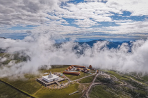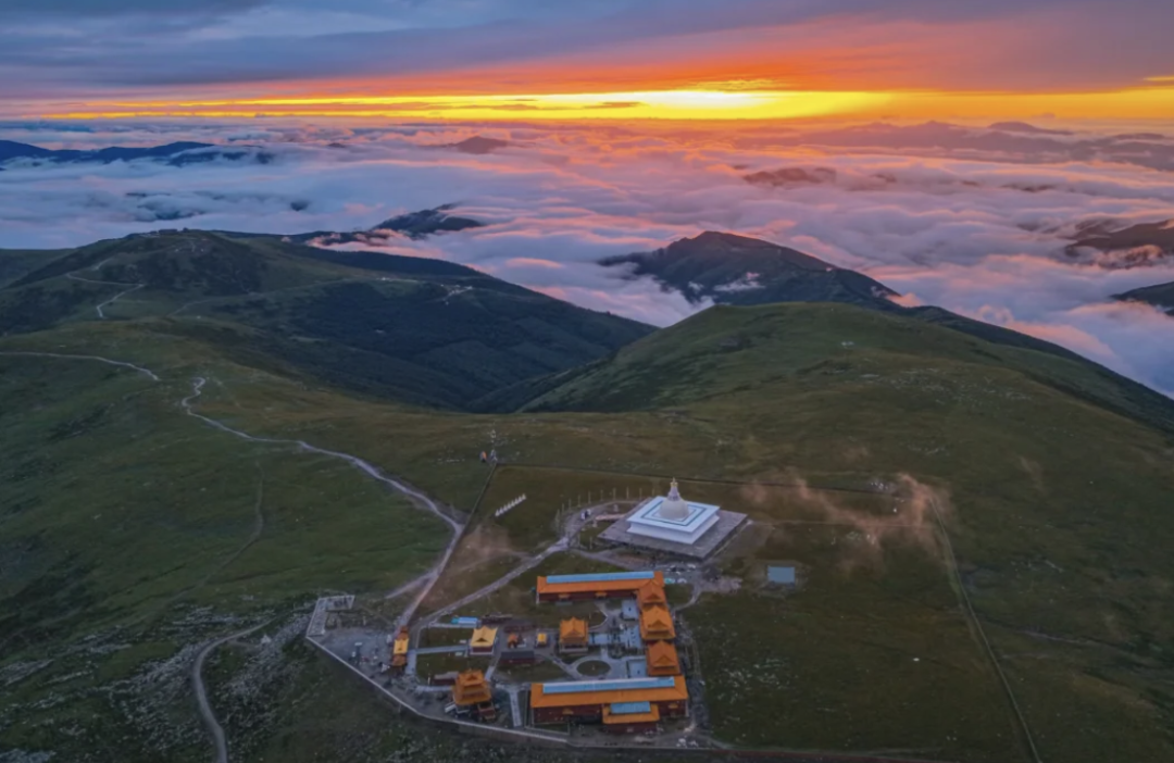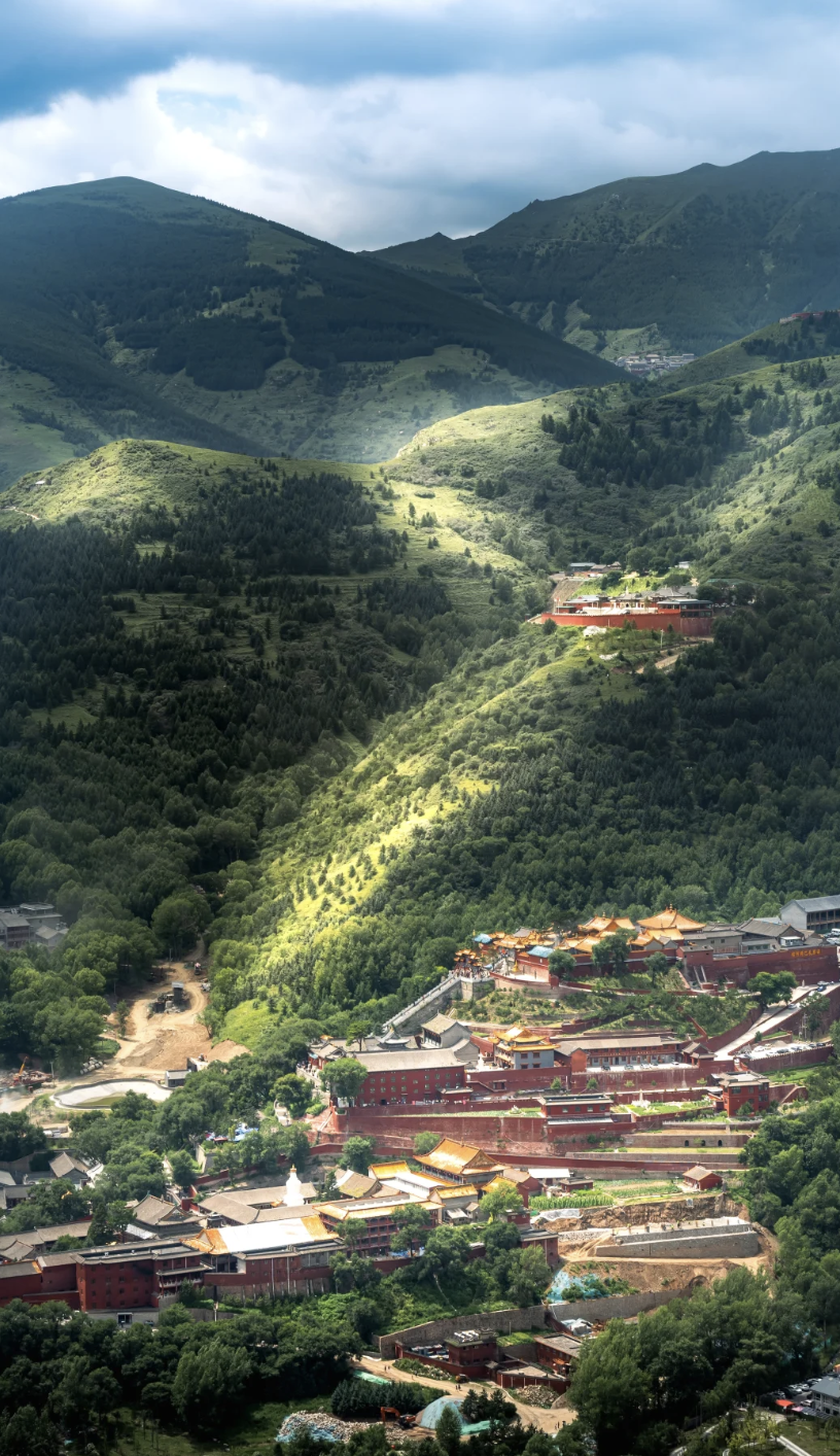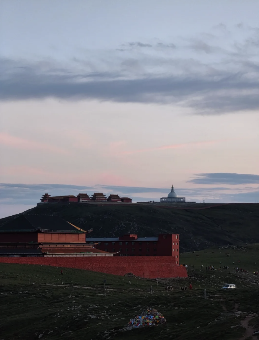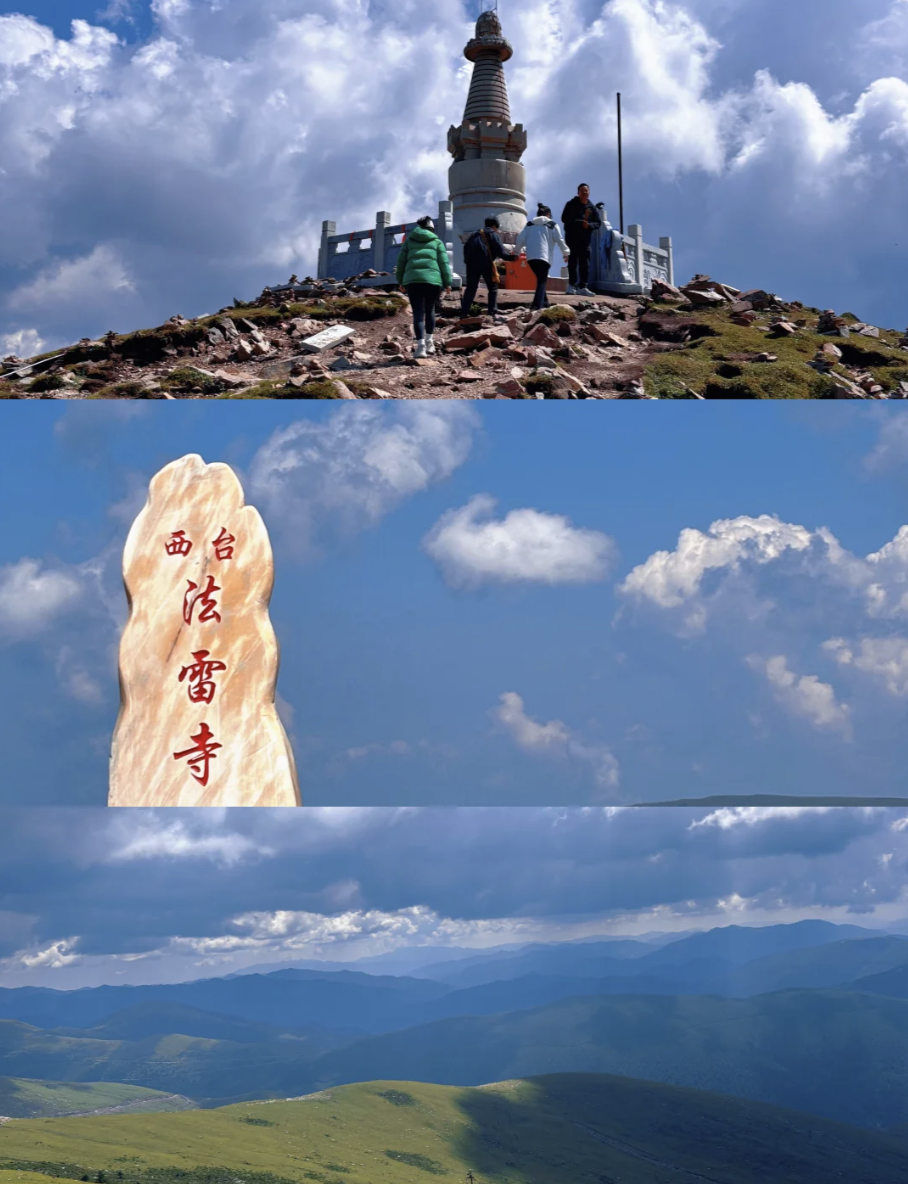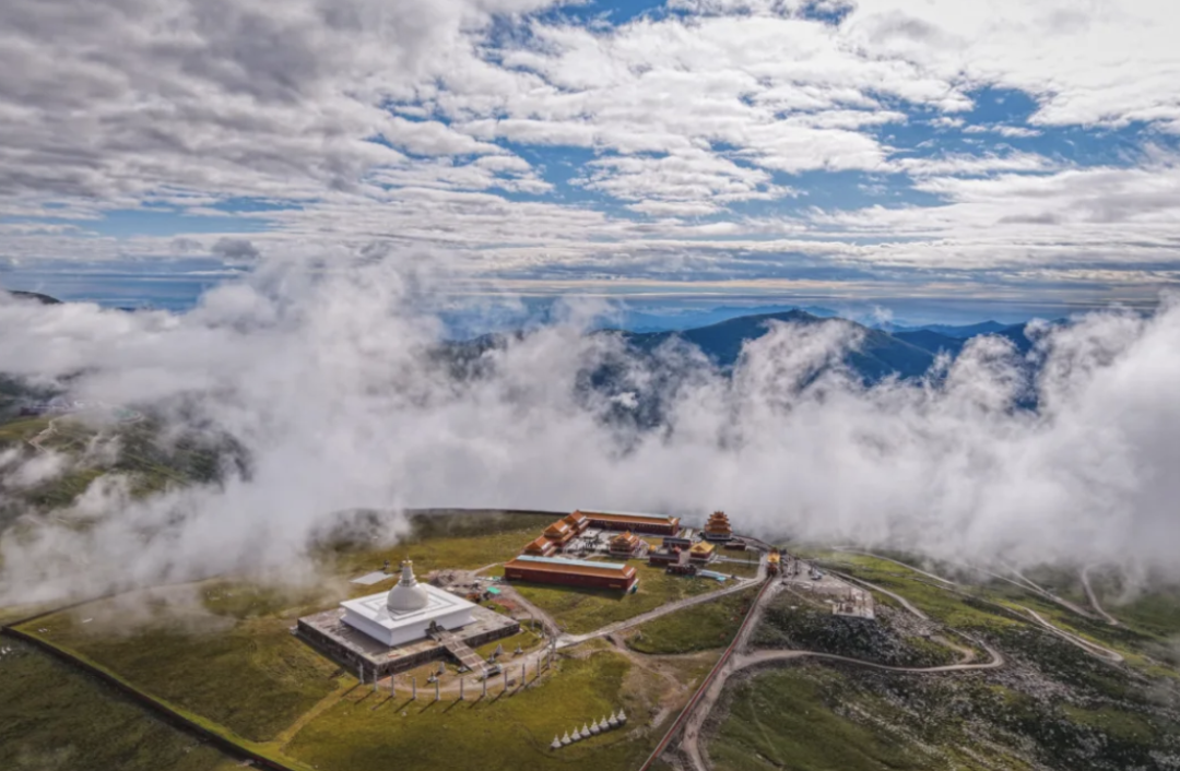 台顶演教寺,内供孺童文殊,此处更是定格山河之美的绝佳之地——立于台顶,群峰尽收眼底,云雾在山间流转,如轻纱漫舞,随手一拍,便是一幅兼具禅意与壮阔的山水画卷。累时,便静卧于细若丝绒的高山草甸,看云卷云舒,听风吟梵唱,感受内心的极致宁静与天地辽阔
