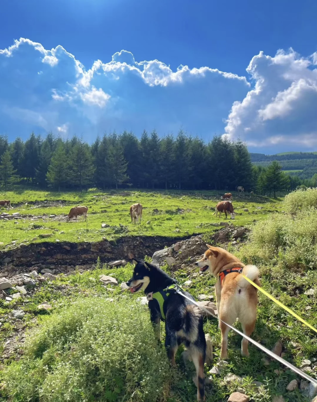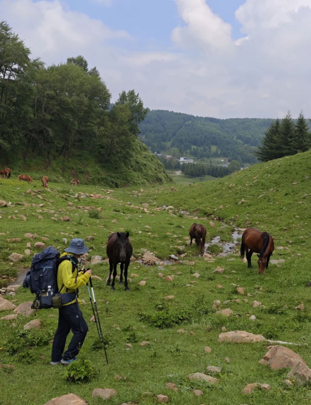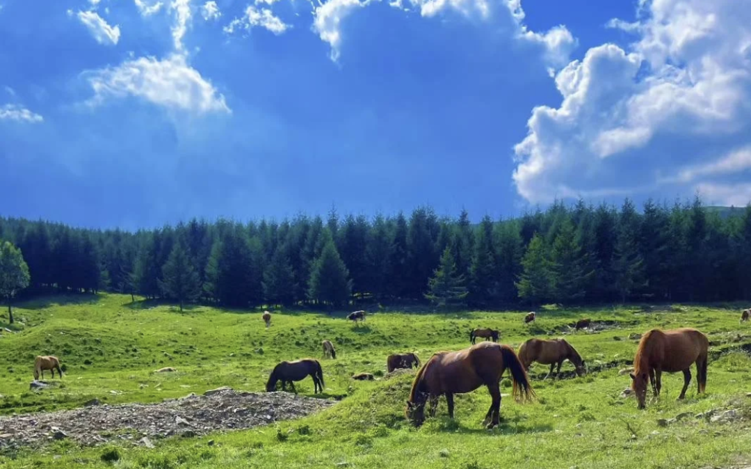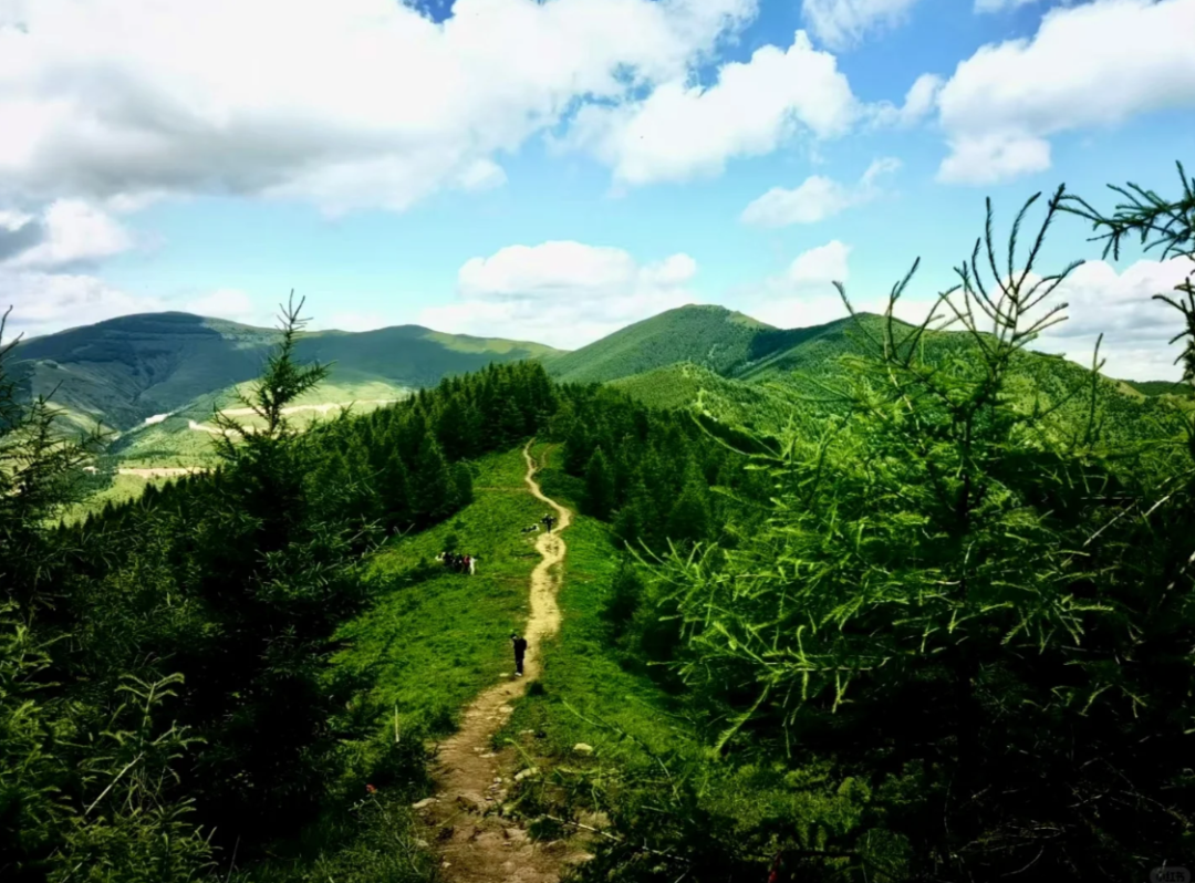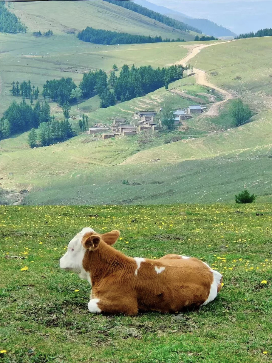 脚下步道蜿蜒,如丝带缠绕山间,两侧是原始林海与辽阔草甸,偶有成群牛马悠闲踱步,风声轻吟,鸟鸣啾啾,便是一路最动听的伴行之音