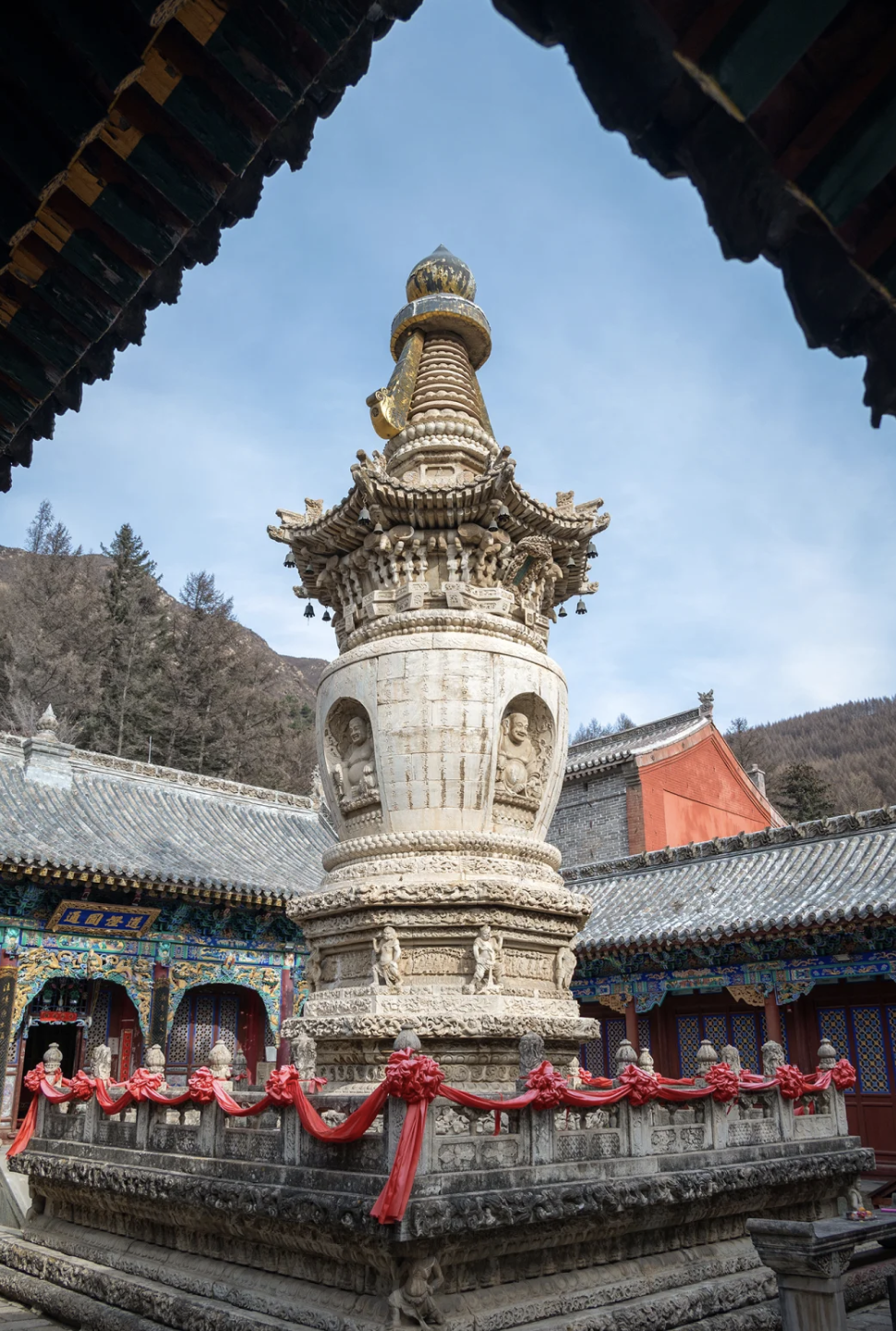台顶灵应寺,内供无垢文殊,此处天气变幻莫测,时而晴空万里,阳光普照;时而云雾缭绕,寒风凛冽,一日之内,恍若历经四季,“寒气逼人夏飞雪,泉声落涧响晴雷”,便是此处最生动的写照