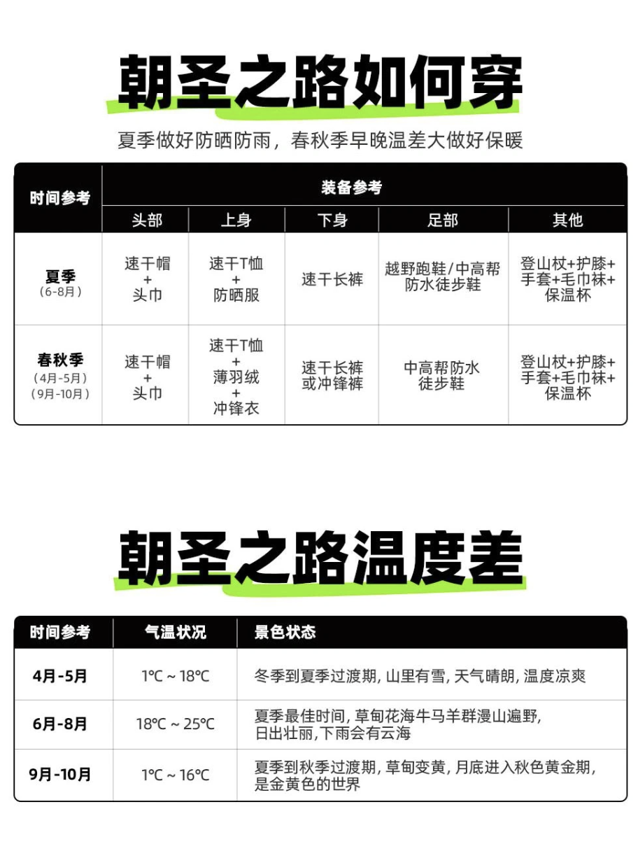 2.衣物:雨衣、护膝为必备之物,以应对多变天气与山路爬坡之需;冲锋衣裤、抓绒上衣(冬季朝台需额外增添)、速干衣裤、保暖秋裤、中帮登山鞋(需提前磨合,建议比正常码数大1-2码,避免徒步磨脚)、毛圈棉袜2双、防晒防雨手套(冬季替换为防风保暖手套);春秋冬三季,需依气温变化,酌情增添羽绒服等保暖衣物。所有备用衣物,建议用塑料袋妥善包裹,谨防雨天淋湿。